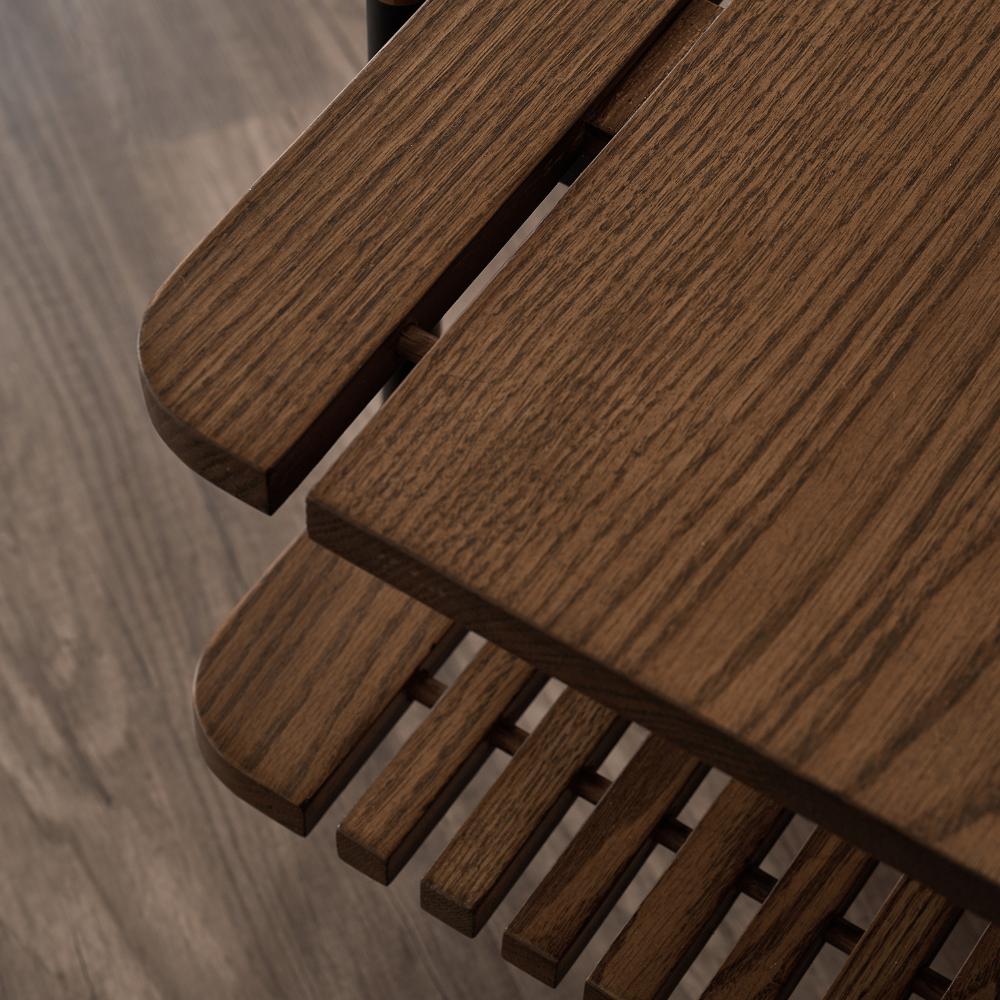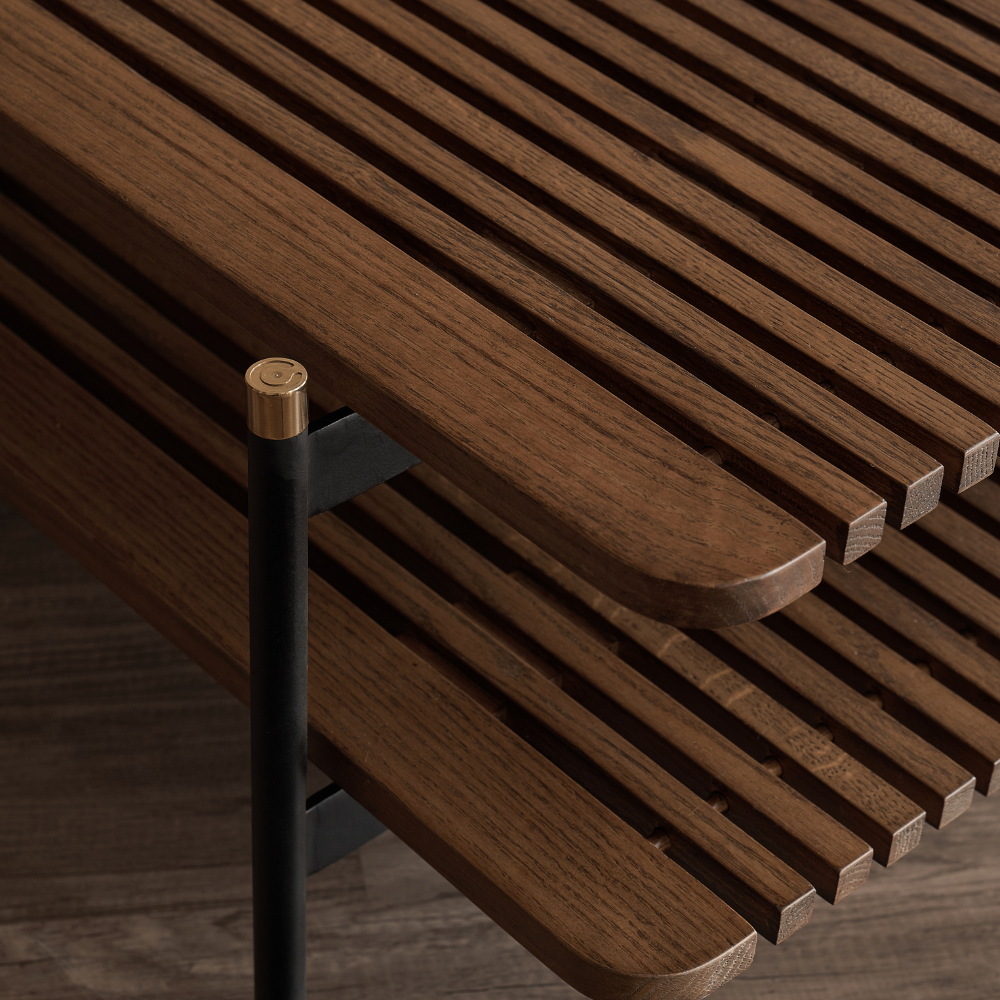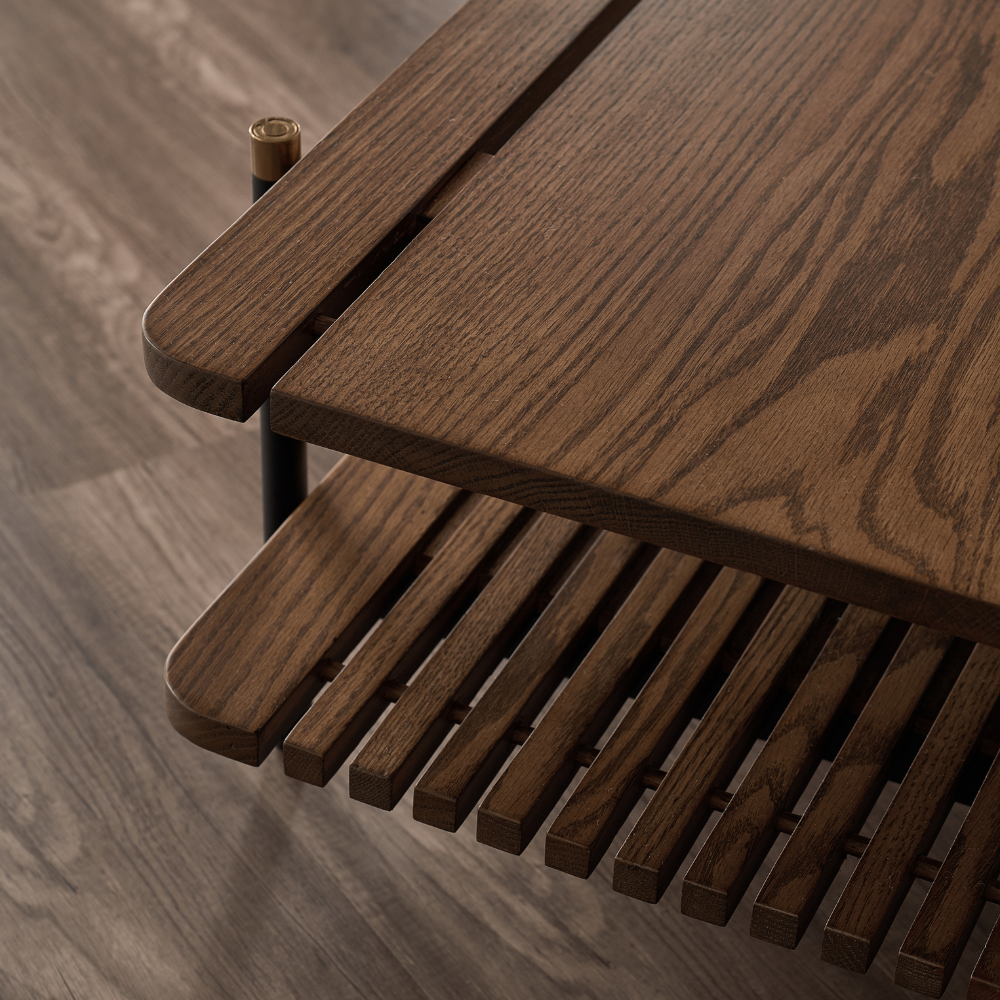 Mặt bàn được làm từ gỗ sồi Mỹ, mang đến cảm giác mộc mạc, bền bỉ và ấm áp. Chất liệu gỗ này không chỉ giúp Perso Coffee Table nổi bật mà còn đảm bảo sự bền đẹp theo thời gian. Gỗ sồi mang lại vẻ đẹp tự nhiên, dễ dàng phối hợp với nhiều loại đồ nội thất khác nhau. Chân bàn được làm từ thép sơn tĩnh điện, vừa tạo vẻ hiện đại, vừa gia tăng độ bền vững cho sản phẩm.