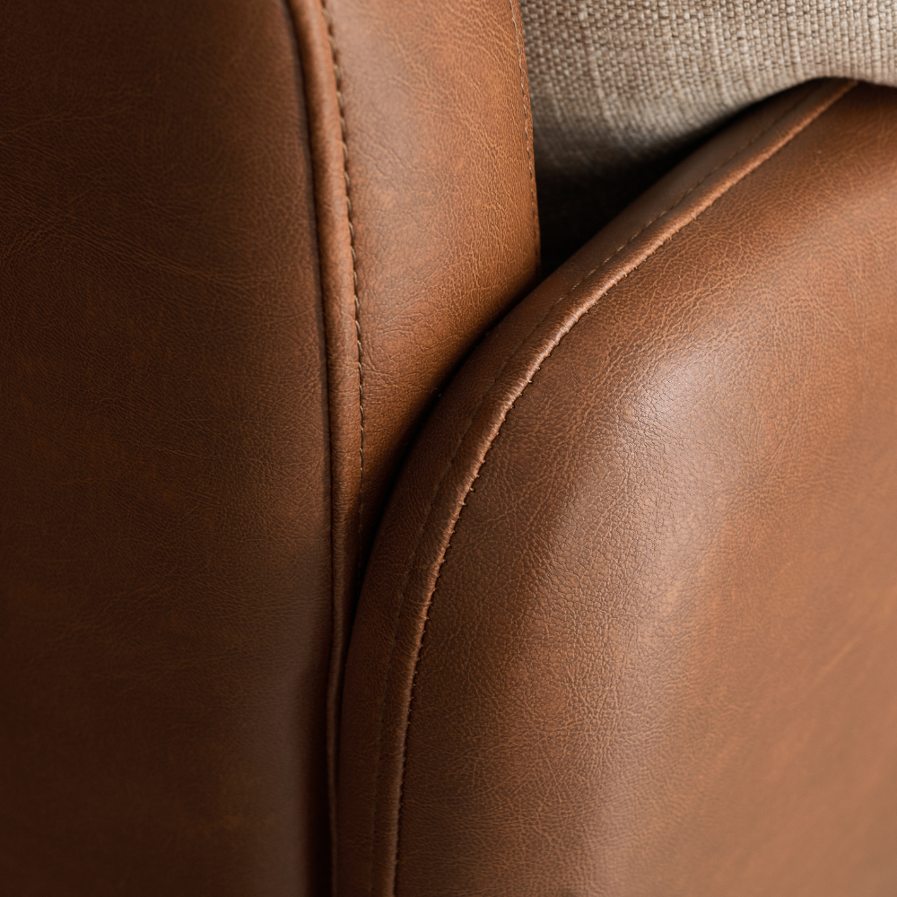 Sản phẩm sử dụng da Microfiber cao cấp cho phần eo và tay, đảm bảo độ bền và dễ dàng bảo vệ sinh học, trong khi ngồi phủ vải Bồ Đào Nha sản phẩm đạt tiêu chuẩn dễ dàng làm sạch, mang đến cảm giác khó ái và thuận tiện trong bảo trì. Chân đế được làm từ gỗ phải chắc chắn, kết hợp chi tiết đồng cao cấp với logo NORDIC dập khuy mạ vàng 24k, tạo điểm nhấn sang trọng, đồng thời phản ánh tinh thần thần thoại của thiết kế Bắc Âu – tối giản nhưng đầy tinh tế.