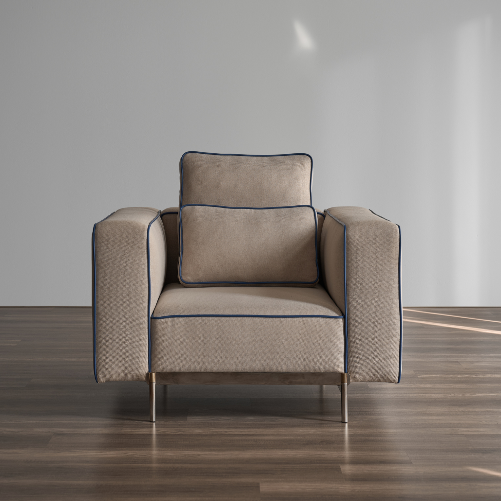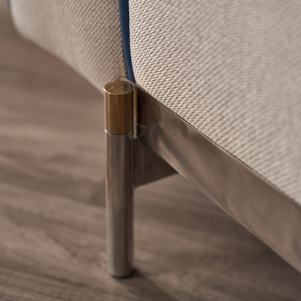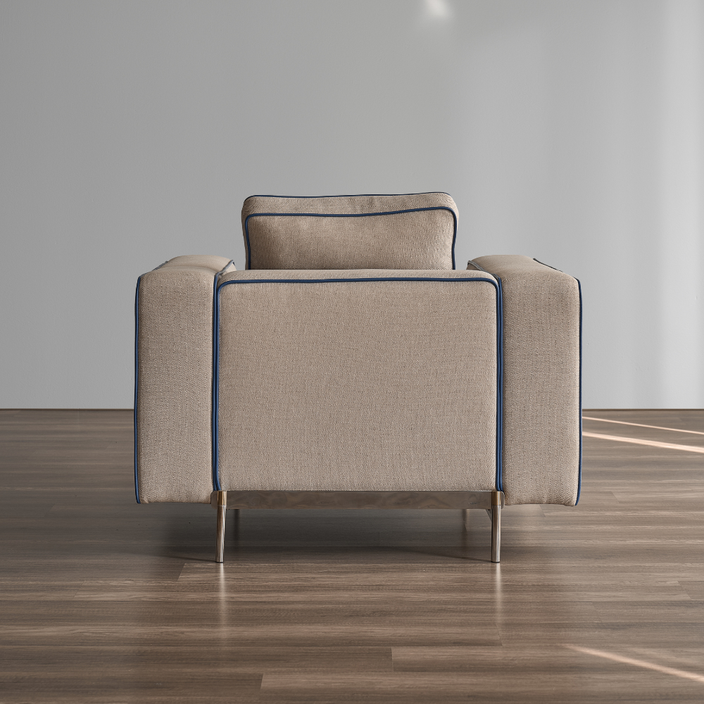 Về vật liệu, phần đệm ngồi của Uni Single Sofa được bọc vải Bồ Đào Nha cao cấp, tạo cảm giác êm ái và mềm mại khi ngồi. Chất liệu này không chỉ mang lại sự thoải mái tối ưu mà còn có tính năng ưu việt như chống thấm nước, chống cháy lan và chống bụi bẩn, giúp việc vệ sinh trở nên dễ dàng và giữ cho ghế luôn mới mẻ qua thời gian dài sử dụng. Phần chân ghế của Uni Single Sofa được thiết kế thanh mảnh nhưng rất thanh lịch, tạo điểm nhấn cho tổng thể sản phẩm. Khung chân làm từ thép sơn tĩnh điện, vừa bền bỉ lại mang tính thẩm mỹ cao, giúp giữ cho ghế luôn vững chắc và bền bỉ theo thời gian. Chân ghế có tác dụng không chỉ làm nổi bật thiết kế mà còn giúp dễ dàng vệ sinh dưới ghế.