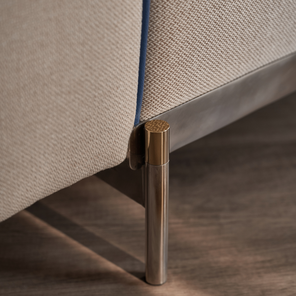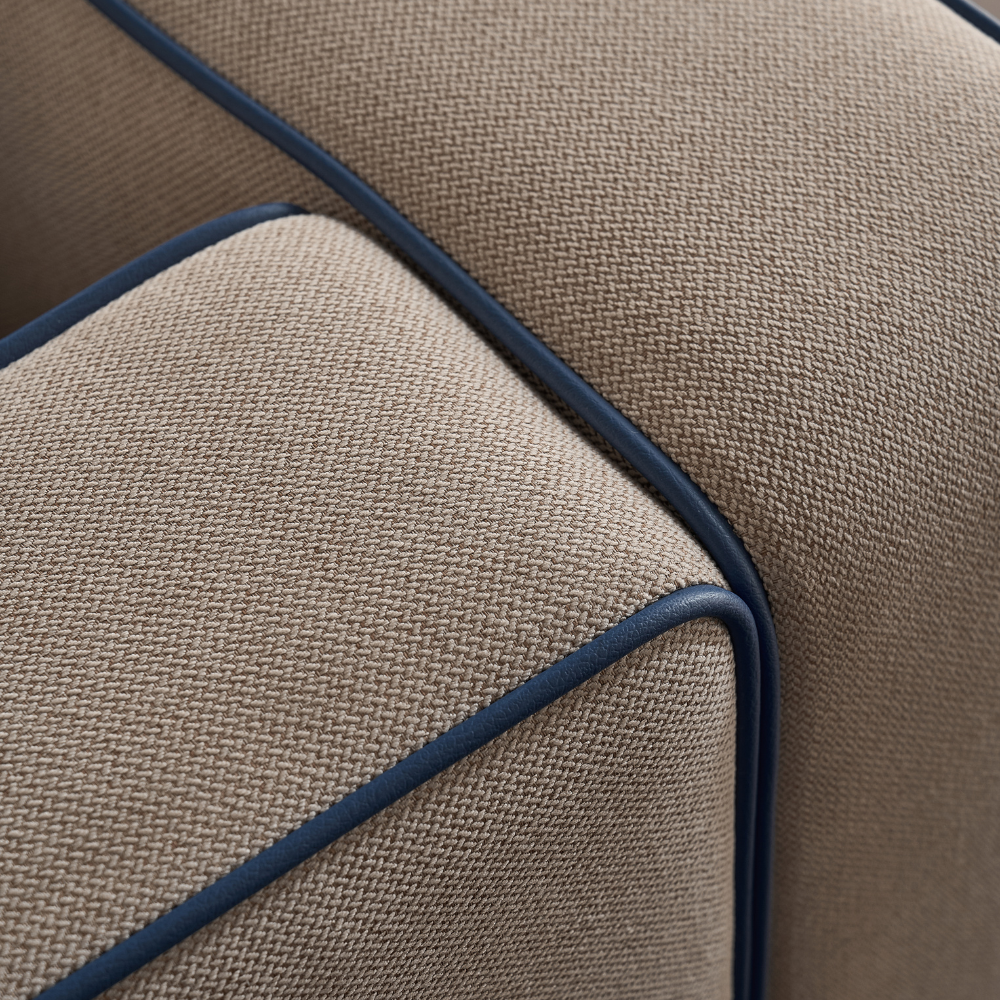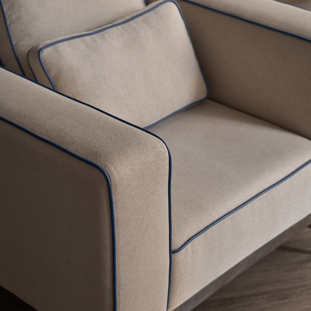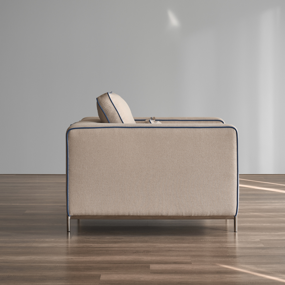 Về vật liệu, phần đệm ngồi của Uni Single Sofa được bọc vải Bồ Đào Nha cao cấp, tạo cảm giác êm ái và mềm mại khi ngồi. Chất liệu này không chỉ mang lại sự thoải mái tối ưu mà còn có tính năng ưu việt như chống thấm nước, chống cháy lan và chống bụi bẩn, giúp việc vệ sinh trở nên dễ dàng và giữ cho ghế luôn mới mẻ qua thời gian dài sử dụng. Phần chân ghế của Uni Single Sofa được thiết kế thanh mảnh nhưng rất thanh lịch, tạo điểm nhấn cho tổng thể sản phẩm. Khung chân làm từ thép sơn tĩnh điện, vừa bền bỉ lại mang tính thẩm mỹ cao, giúp giữ cho ghế luôn vững chắc và bền bỉ theo thời gian. Chân ghế có tác dụng không chỉ làm nổi bật thiết kế mà còn giúp dễ dàng vệ sinh dưới ghế.